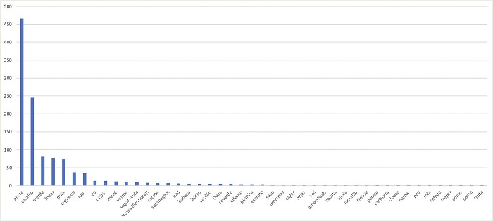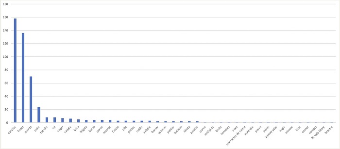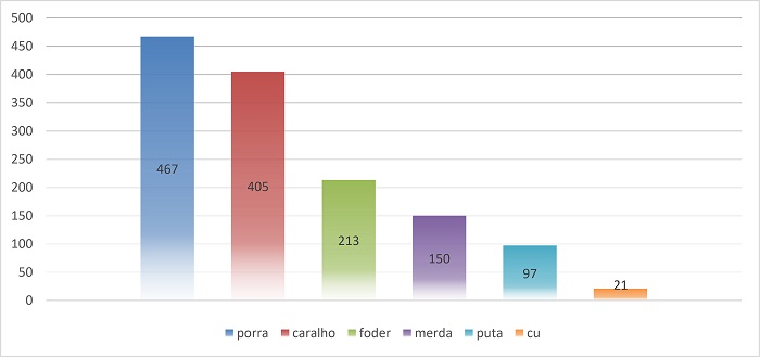 Todavia, apenas seis formas tabu estão presentes em todos os seriados analisados: caralho, cu, porra, foder, puta e merda, chegando a 1353 ocorrências totais, portanto a uma taxa de 80%.