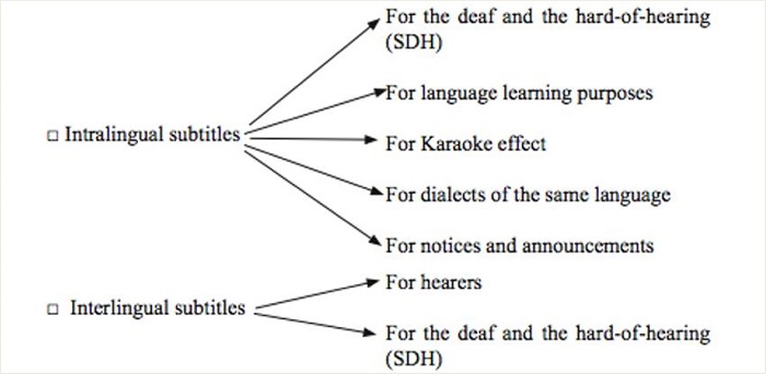 As legendas podem ser interlinguísticas e intralinguísticas e têm objetivos e público-alvo diferentes, assim como fica bem ilustrado no esquema que segue: