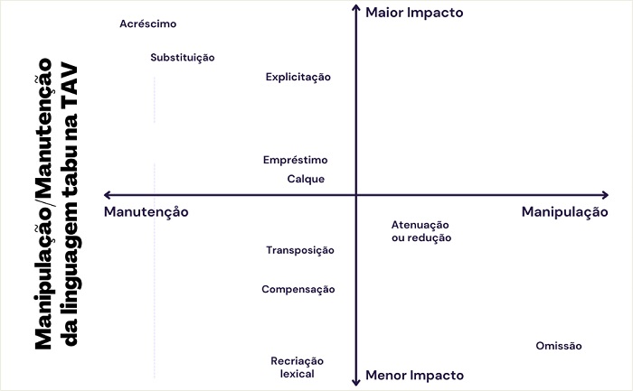 Na legendagem da linguagem tabu, é essencial ter em conta as restrições espaço-temporais que acabamos de descrever para que se possa implementar uma série de estratégias capazes de transferir as formas de turpilóquio para a língua target. A classificação das estratégias de tradução escolhidas para esta análise das legendas em italiano e inglês do nosso corpus foi desenvolvida a partir dos estudos de Vinay e Darbelnet (2000), Gottlieb (1994), Díaz Cintas (2003), Díaz Cintas e Remael (2007), adaptando-as para este estudo. Para descobrir se as legendas em italiano e em inglês dos seriados objeto da nossa análise foram censuradas ou atenuadas, ou se as formas de turpilóquio e de linguagem tabu foram mantidas em sua tradução, optamos pelas seguintes estratégias: