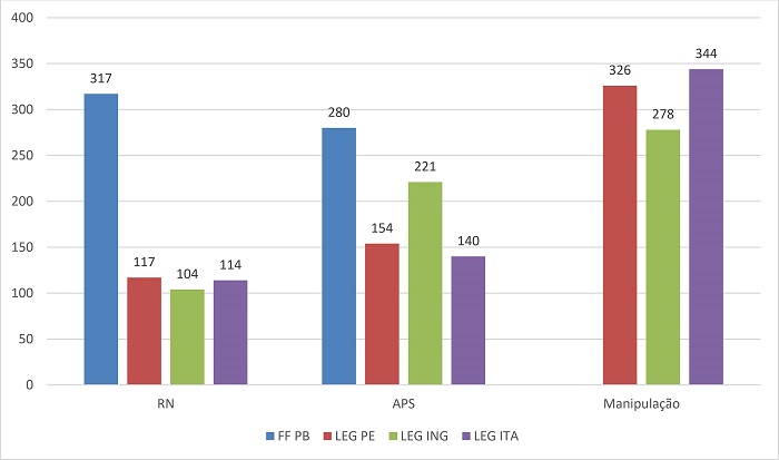 Todavia, se uma primeira análise desses resultados poderia nos dizer que a manipulação, entendida como toda a gama de possíveis fatores que não mantêm e/ou não veiculam o valor ideológico e pragmático-semântico da linguagem tabu, foi a macroestratégia mais utilizada nas legendas de DOM em PE e em ITA e nas legendas de Irmandade em ITA; temos que ressaltar também que em todas as legendas de Rabo de Peixe e nas legendas em inglês dos três seriados a macroestratégia e as microestratégias de manutenção são sempre a maioria das opções tradutórias.