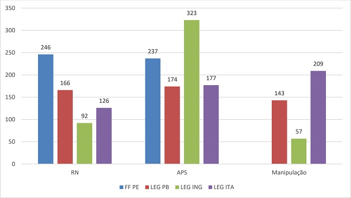 Quanto às macroestraégias tradutórias, a manutenção é a macroestratégia mais utilizada tanto nas legendas em PB (71%) e em ING (86%), quanto nas legendas italianas (62%), tendencialmente mais conservadoras. A omissão de RN é menos marcada, se comparada com quanto descrito para DOM no gráfico 8. Em termos microestratégicos, como se pode ver claramente no gráfico. 9, as legendas em inglês, através da microestratégia de Acréscimo, registram um número de APS superiores tanto em relação ao original, quanto em relação às legendas em PB e ITA.