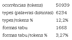 A nossa amostra de fala fílmica consiste em mais de 50 mil ocorrências (tokens) e mais de seis mil types, assim como se pode ver na tabela 1. Pelo que se refere às formas de linguagem tabu e de turpilóquio, elas são 1668 ocorrências (3,27% da totalidade dos tokens).