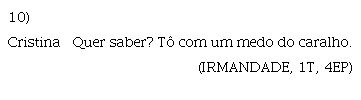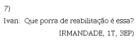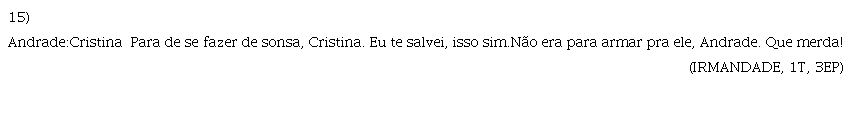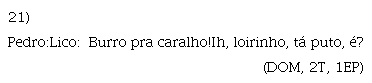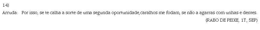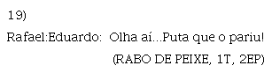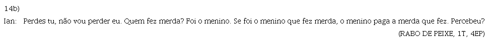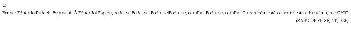 De fato, no seriado português a maioria das respostas neurológicas (interjeições e imprecações) se realiza através das formas tabu “Foda-se!” (102 ocorrências) e “Caralho!” (144 ocorrências). Além dessas duas formas, encontramos uma ocorrência de “Puta merda!”, uma de “Que merda!” e uma que pertence à esfera da profanidade: “Cristo!”.