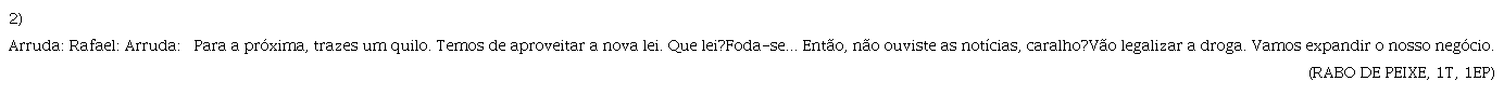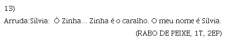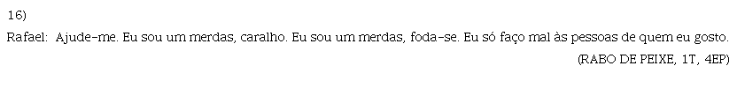 O segundo seriado que analisaremos é Rabo de Peixe (Netflix) dirigido pelo diretor açoriano Augusto Fraga. Esse seriado é ambientado nos Açores, todavia a particularidade é que a fala fílmica não foi formulada com o propósito de reproduzir de maneira verossímil o português falado nos Açores. De fato, podemos considerar a fala fílmica do seriado muito próxima a um PE neo-standard e os traços diatópicos mais salientes se referem ao uso de formas tabu locais. Contamos cinco formas tabu açorianas: zabela6, naião7, pintcha8, baboso9 e blica10 usadas para conotar diatopicamente a fala fílmica do seriado. Todavia, computamos apenas 16 ocorrências dessas cinco formas, tratando-se de apenas o 3,3% das 483 formas tabu encontradas no seriado português.