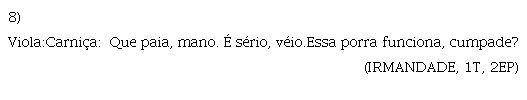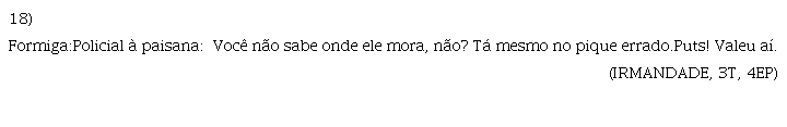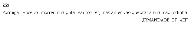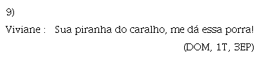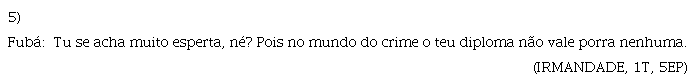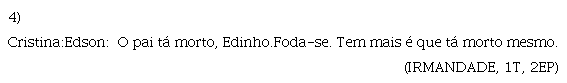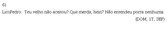 Como já afirmamos, a linguagem tabu transmite e fornece ao espectador informações sobre os falantes e diz mais respeito ao estado de espírito do falante, ao contexto e à situação comunicativa em que o enunciado ocorre do que à sua classe social, ao gênero e à sua formação cultural.