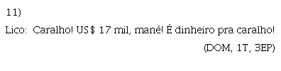 Quanto ao uso de “Caralho”, podemos considerar essa forma tabu igualmente empregue tanto no PE (no minicorpus português computamos 158 ocorrências), quanto no PB (no minicorpus brasileiro computamos 247 ocorrências). Na nossa amostra, “Caralho” é usado principalmente como imprecação/interjeição, enquanto computamos apenas 91 ocorrências de seu emprego como ação psicossociocultural: como intensificador positivo de uma propriedade graduável (10 e 11), como intensificador negativo com função de depreciativo (12), como predicativo para uso exclusivo como forma negativa (13).