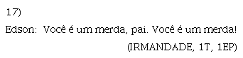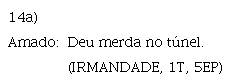 Na nossa amostra encontramos 150 ocorrências, quase todas ações psicossocioculturais que vão da ofensa ao uso intensificador e à função de depreciativo, tanto como adjetivo, quanto como nome. Além disso, encontramos dois tipos de construções verbo-suporte (CVS) com “merda”: “dar merda” (construção impessoal que significa que algo deu errado) e “fazer merda” (significa que alguém fez algo errado) em que o núcleo de significado do predicado (complexo) está na expressão nominal, no nosso caso “merda”, situada à direita do verbo (14a e 14b). Dentro das respostas neurológicas, computamos apenas seis ocorrências como imprecação (15), enquanto como insulto no singular registramos uma forma mais empregue no minicorpus português: “Merdas” (16) e uma mais utilizada no minicorpus brasileiro: “Merda” (17):