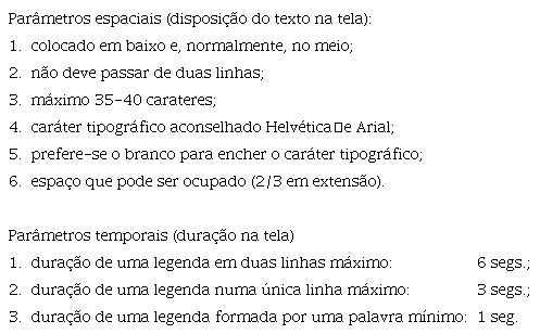 A estes parâmetros espaço-temporais devem-se acrescentar vínculos textuais/qualitativos, como: a legibilidade (que se liga ao conceito de usabilidade do produto, dado que está vinculada à escolha do caráter e ao fundo sobre o qual aparecem as legendas) e a segmentação (spotting) das legendas. Quanto à segmentação, seria recomendável: segmentar o texto em duas linhas em vez de uma linha muito comprida; que cada legenda contivesse uma frase completa; que as legendas fossem estruturadas logicamente tanto do ponto de vista sintático quanto do ponto de vista semântico (Díaz Cintas, 2003).