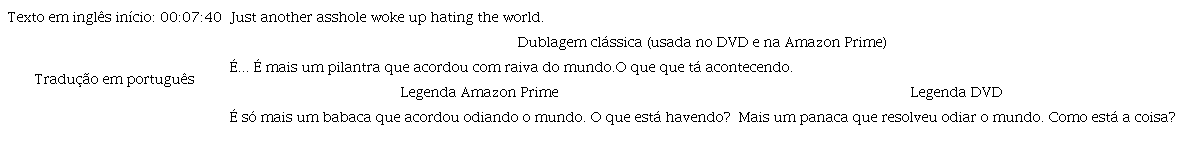 No que tange às legendas, temos “Ei, desgraçado” para a tradução de “Hey, dirtbag” no streaming e “Palhaço” na tradução do DVD remasterizado de 2005. O termo “dirtbag” tem tom depreciativo e se trata de uma forma de insulto relativo a alguém detestável que fez algo desonesto ou inaceitável. Embora o termo em inglês não seja considerado exatamente um palavrão, verifica-se o caráter de insulto. A tradução do DVD – “palhaço” – nos parece uma solução mais datada, fazendo-nos lembrar de Walter Benjamin (2001), no seminal A tarefa do tradutor, em que afirma serem datadas as traduções. Na dublagem comparece “cretino”, que também nos parece uma suavização. As duas traduções, portanto, apresentam um tom mais suave do que a tradução do streaming – “desgraçado7” – termo ofensivo de cunho religioso e que não é tomado hoje como um palavrão, mas que, historicamente, pode ser visto como uma grande ofensa8.