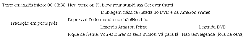 Nesse momento, Cobra entra no estabelecimento comercial onde o bandido está armado e ameaçando os reféns. Uma dessas ameaças é: “I’ll blow your stupid ass!”. Temos aqui o uso de uma forma de insulto que tem referência à parte do corpo, no caso, a traseira – “ass” – e que é considerado um termo chulo. O referido termo, dependendo do contexto, pode ser entendido como “bunda”, “rabo” ou mesmo a forma bem mais chula de ânus – “cú”4 (semelhante ao que já foi comentado na discussão sobre “asshole”). No caso do referido fragmento, temos “ass” como um substantivo que é modificado e intensificado pelo uso do adjetivo “stupid”. Assim, o bandido não apenas ameaça explodir os reféns, mas também claramente os insulta, com um termo chulo, ainda que possa ser considerado bem menos ofensivo do que um “motherfucker” (já comentado). No DVD, por se tratar de uma fala que está fora de cena (ao fundo), em tom mais baixo, o trecho não foi traduzido/legendado. Já no streaming, a fala é traduzida de forma funcional, mas suavizada. O tom de ameaça é certeiro – “explodir os miolos” era de uso comum, mas o problema é que no filme há um insulto além da ameaça. Como já apontado, há uma diferença entre o que se diz e o modo que se diz. No texto de partida há xingamentos explícitos, que desaparecem na tradução do streaming. Assim, podemos considerar que houve uma suavização na tradução disponível na Amazon por apresentar uma total omissão do insulto. Na dublagem houve uma condensação ainda maior, bem como a total omissão do insulto. Sustentamos que houve um grau de manipulação do texto nas duas traduções (dublagem e legendagem), de modo a torná-lo mais aceitável e, portanto, consumível no contexto de chegada.