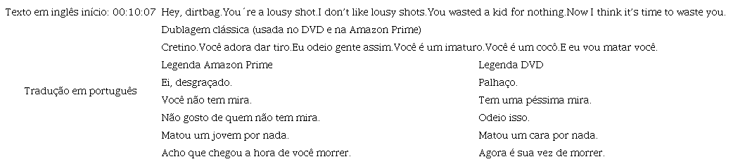 (Fan, 2016, p. 1, grifo nosso).Fan (2016), por sua vez, comenta a censura devido à violência presente no filme, ao mesmo tempo em que ressalta o grande sucesso de bilheteria obtida. Seja como for, as tentativas de “suavizar” o filme com cortes já aponta para a censura à época, corroborando como as produções audiovisuais, assim como as literárias, sofrem pressões de outros sistemas. Assim, se Even-Zohar chamava a atenção para o quanto os fatores extraliterários modelam a prática e a circulação de obras literárias, as releituras de Carvalho (2005) e Azevedo (2020) desse trabalho nos mostram como fatores externos ao polissistema audiovisual modelam os produtos audiovisuais em cada polissistema cultural, incluindo suas traduções. Observamos que o filme “original”, ou seja, o próprio produto foi sendo “alterado” devido a leituras que instâncias de poder, como o Ministério da Justiça do Brasil, fizeram nos contextos de recepção dessas obras, independentemente de se considerar a tradução em si. No que tange à tradução, veremos que as escolhas também passaram por formas de censura, no caso, uma suavização dos insultos nas duas traduções para legendagem analisadas.