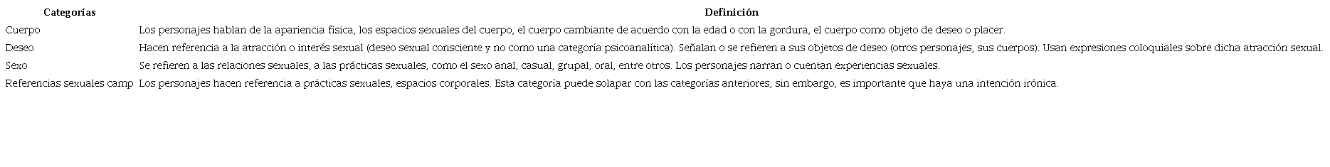 Para esta investigación, el corpus principal comprende todos los diálogos en inglés de la serie (18 episodios, 30 minutos de duración cada uno) y la película (90 minutos), con un total de 84 660 tokens. El corpus principal sirvió para el análisis narratológico —basado principalmente en el modelo de Barthes (1970), aunque con la variación de crear categorías emergentes a partir de las funciones (personajes), acciones y temas de la serie—. Las categorías emergentes sumaron un total de 28, a partir de 1282 segmentos de diálogos codificados que constituyen el corpus específico (Villanueva-Jordán, 2021a). Entre las categorías emergentes se pueden resaltar el cuerpo, el deseo, la feminización, los referentes culturales, la clase, la raza/etnicidad, la edad, la salud y las relaciones familiares/amorosas. Para los fines de este artículo, se han seleccionado las categorías relacionadas con la sexualidad que se definen en la tabla 1.