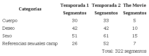 Una característica de los picos que se observan en la figura 1 (temporada 1, episodio 5; temporada 2, episodio 3; The Movie) es que corresponden a los episodios en los que se mostraban escenas sexuales o las acciones entre los personajes representaban intimidad. En la tabla 2, el total de segmentos que hacen referencia a la sexualidad también demuestra la importancia del tema (322 segmentos en total, que equivalen a un 25 % del corpus específico), e incluso que las referencias sexuales camp son más recurrentes en la segunda temporada.