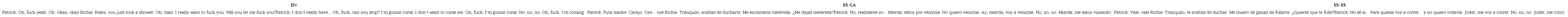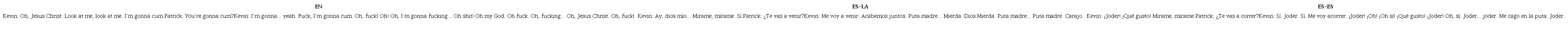 En las tablas 3 y 4 se presentan ejemplos con las versiones traducidas para América Latina (en adelante, ES-LA) y España (español peninsular, ES-ES). En estas escenas, las imágenes muestran los cuerpos en dinámicas que van entre lo implícito y explícito del acto sexual. La explicitación del acto sexual se basa en mostrar los cuerpos desnudos y sus movimientos, mientras que lo implícito se relaciona con los primeros y medios planos en los que se privilegian los gestos. Al analizar el modo lingüístico de ambas escenas se puede identificar que la mayoría de las unidades son interjecciones (“Oh, fuck!”) con las que se pretende significar el orgasmo. Solo algunas oraciones tienen coherencia, en estas los verbos destacados resultan ser fuck y come/cum. En el caso de fuck, además de aparecer como una interjección, sin mayor valor semántico, aparece como verbo transitivo (“I really want to fuck you” en la tabla 3), lo que posiciona al sujeto que penetra y al sujeto receptivo.