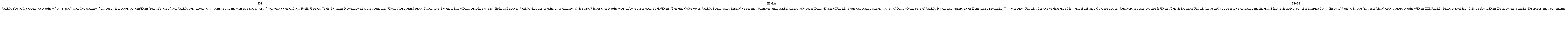 En ese mismo diálogo, Patrick no se identifica solo como un gay activo, sino que asume una posición más dominante, masculina, como en el caso de Matthew, y por ello se define como power top. En la versión ES-LA, se opta por una frase eufemística “estoy llegando a ser muy bueno estando arriba”; sin embargo, esta expresión no moviliza los componentes (dominación, expresión de género masculina) de la frase en inglés. En el caso de la versión ES-ES, se propone que Patrick tiene una faceta de activo dejando entender que su faceta de pasivo estaba más “avanzada”. Otro elemento relevante de este ejemplo sucede cuando Dom llama a Patrick “size queen”, que implica que le interesan sobre todo hombres con falos grandes y con lo que se cuestiona la masculinidad de Patrick y su posición sexual penetrativa. En español, la manera en que Dom responde la pregunta se aleja de la versión en inglés. En la versión ES-LA, la insinuación de Dom se omite y se transforma en una pregunta sobre si le interesa Matthew. En el caso de la versión ES-ES, la respuesta es directa y no insinúa que Patrick es pasivo. De esta manera, el léxico relacionado con la posicionalidad sexual sí plantea retos en la expresión en español, que en su expresión en ingles pueden crear ciertas incongruencias con las líneas argumentales de Looking.