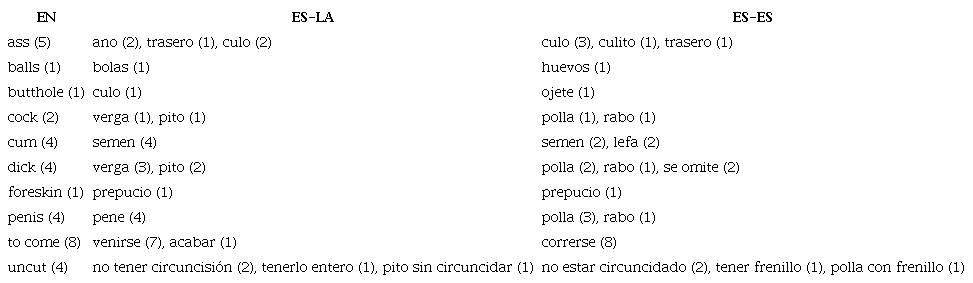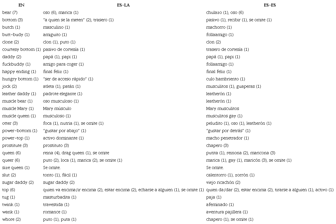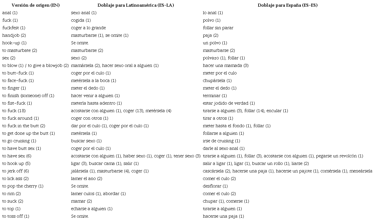 Asimismo, en las últimas páginas de este artículo, se encuentra un apéndice con las unidades y frases relacionadas con la sexualidad, extraídas del corpus bilingüe. El contraste entre unidades de la versión en inglés y de las versiones dobladas revela los múltiples destinos y formas que toman las referencias sexuales en español. Esta investigación no tiene como propósito valorar mejor una versión doblada frente a la otra; más bien, como se propondrá más adelante, el estudio permite señalar qué marcos interpretativos podrían ser más o menos pertinentes para comprender la representación audiovisual del homoerotismo y su traducción.