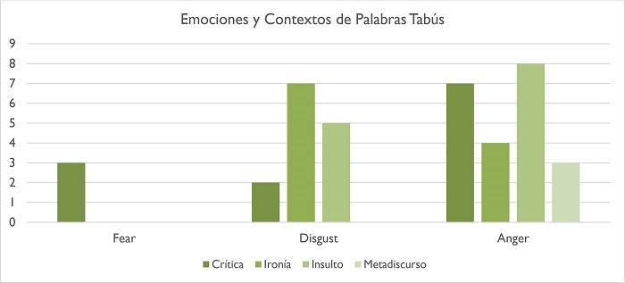 En las representaciones de las emociones en cuanto personajes de la película, nos interesa particularmente analizar el uso que hacen de palabras tabús estas tres emociones moralmente negativas en contextos relacionados a: la expresividad, la ironía, los insultos y el metadiscurso, por considerarlos problemas específicos de traducción para las palabras tabús (Chamizo Domínguez, 2018; De Rosa, 2015b; Luque Durán et al., 1997). Los resultados de la distribución y frecuencia son bastante claros a pesar de los pocos datos, como se pueden observar en la Figura 1.