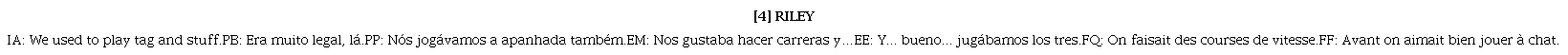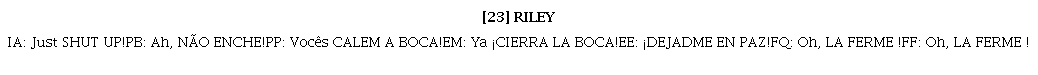 Los ejemplos [20] y (21) son réplicas de Riley a su madre y los ejemplos (22) y [23] a su padre. Las contestaciones a su padre que culminan en el ejemplo [23] son gritadas (mayúsculas en el guion), comportamiento tabú para una niña o niño de 11 años en el frame crianza. Por cierto, las estrategias de realizaciones prosódicas y tensión vocal son también pragmáticamente variables, según las convenciones de actuación y los recursos vocales que afectan la calidad de voz y son culturalmente marcados (Sánchez-Mompeán, 2020).