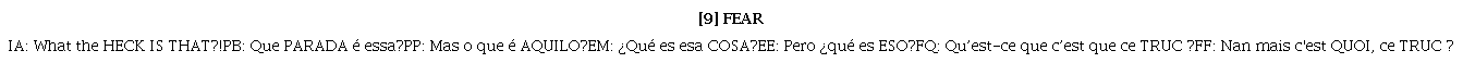 Estas construcciones con heck se utilizaron de forma expresiva por la emoción Fear, y por el amigo imaginario de la niña Bing Bong, quien tiene una complejidad mental y emocional correspondiente a las edades de los tres a los cinco años, a la par con el desarrollo del lenguaje del niño hasta la etapa de pre lectura, como se demuestra a lo largo de la película Bing Bong no sabe leer. En el caso de Fear la fórmula tabú está intensificada por la marcación prosódica del guion en inglés (con mayúsculas indicando intensidad y tensión vocálica en su realización en el ejemplo [9]). En el siguiente apartado veremos cómo esta emoción selecciona palabras tabús para expresar sobre todo su evaluación negativa sobre hechos o personas.