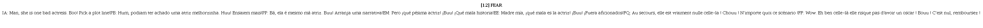 La emoción Fear se presenta en la película como: That’s Fear. He’s really good at keeping Riley safe. Se trata de una emoción moralmente negativa, pero con una negatividad que recae sobre el self: “The more negative moral emotions are anger, disgust, contempt, embarrassment, shame and guilt” (Culpeper et al., 2014, p. 70). El miedo sería una emoción del tipo “self-conscious”, o sea, autoconsciente relacionada a la timidez, vergüenza y culpa. El personaje Fear de la película realiza palabras o comportamientos tabús de forma atenuada y en los tres contextos de palabras tabús que describimos en [12], (13) y (14) observamos apenas el uso de formas de evaluación negativa (expresividad de valencia negativa). En los ejemplos [12] critica a la actriz que ve por la tele, (13) evalúa críticamente una situación y (14) se queja por la tarea que le tocó de noche, vigilar los sueños. Los usos de palabras tabús de forma eufemística [12] bad y (13) THIS, o disfemística (14) stupid, se dan en contextos de expresividad negativa, no tensionan directamente la imagen del interlocutor a través de la ironía (burla) o descortesía (ataque) como se ve con Disgust y Anger.