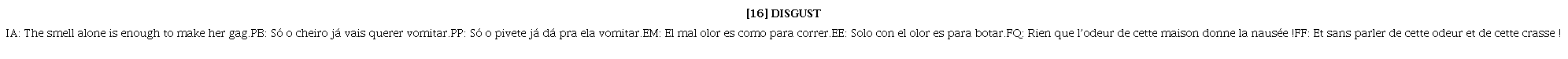 La emoción Disgust se presenta en la película como: This is Disgust. She basically keeps Riley from being poisoned, physically and socially. Se trata de una emoción moralmente negativa, que se representa de forma ficcional sobre todo a través de la ironía (ataques indirectos, con doble sentido), pero también con algunos contextos de insultos (ataques directos) y de expresividad negativa. Los contextos de expresividad negativa de esta emoción están muy relacionados a los sentidos, al olfato (15) o a consecuencias físicas de mal estar como sentirse descompuesto [16].