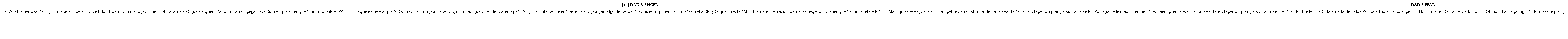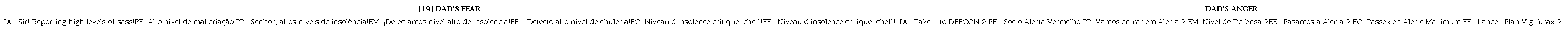 Además de las pistas prosódicas, se presentan figuras de lenguaje relacionadas al cuerpo, al calor y al medio militar en [17] y (18) con respecto a la expresión put the Foot down. Es interesante observar que esta “guerra” de Anger en la cabeza de los personajes humanos pasa por el filtro social y sale por la boca de la niña, del padre o de la madre de forma modificada, con elecciones estratégicas menos impetuosas y más controladas. En contextos más tempranos o en contextos de enfrentamientos más fuertes, Anger se expresa por sonidos, gruñidos, más que cualquiera de las demás emociones. En los momentos de auge de esta emoción se habla de explosión, fuego, ataques. La prosodia de esta emoción en la cabeza del padre reproduce el frame del ejército, con sus relaciones jerárquicas, sus entonaciones imperativas, la cadencia silábica y la entonación plana, con poca modulación melódica, pero con multiplicación de acentos de intensidad. Se hacen incluso referencia a planes de estrategias de ataque y defensa específicos del campo militar (en [19]), localizados culturalmente en las diferentes versiones (Lins & Cordeiro Campos, 2023).