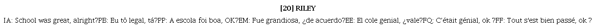 En la relación hija-padre o hija-madre no se esperan comportamientos con contestaciones irónicas como en [20] en el que se presenta un enunciado con semántica positiva great pero con un marcador del discurso - alright? - y una entonación disonantes de esa positividad. La prosodia no es de valencia positiva, ni la calidad de voz en ninguna de las versiones dobladas. En el ejemplo [20] Disgust está en el comando de las emociones de Riley, mientras que en los ejemplos (21), (22) y [23] Anger está al frente del comando.