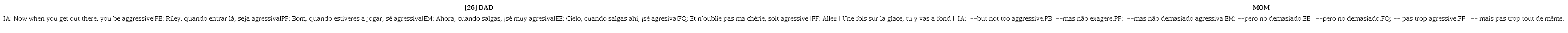 En la partida final de Hockey de la película cuando todo se arregla y cada uno encuentra su lugar Anger es quien vuelve al control de las emociones, de forma positiva, a pedido de Joy, como se ve en el ejemplo (25). Las emociones tienen condicionantes situacionales para su evaluación: en un velorio no se esperan sonrisas ni risas, tampoco en un casamiento se esperan gritos, insultos o tratamientos descorteses. En el frame deporte, Anger es un comportamiento esperado y tiene valencia positiva. Incluso se lo recomiendan los padres a Riley al final de la película, poco antes que empezara el partido de Hockey [26] be aggressive // not too aggressive.