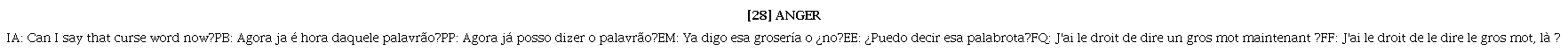 El personaje Anger evoca el uso de palabras tabús usando metadiscurso, como una forma indirecta de hacer referencia a la palabra sin decirla. A lo largo de la película estamos en la mente de una niña de 11 años, Anger conoce “la palabra” pero sabe que no puede decirla (Jay, 2018). En el ejemplo (27) la niña llega a la casa nueva, no le gusta, sus cosas de la mudanza no llegaron, los padres se pelean, en fin, toda su vida feliz de los primeros años de vida en Minnesota se derrumba en San Francisco. Y en el ejemplo [28] después de su presentación en clase el primer día, que terminó llorando, Anger vuelve a evocar esa palabra prohibida con metalenguaje.