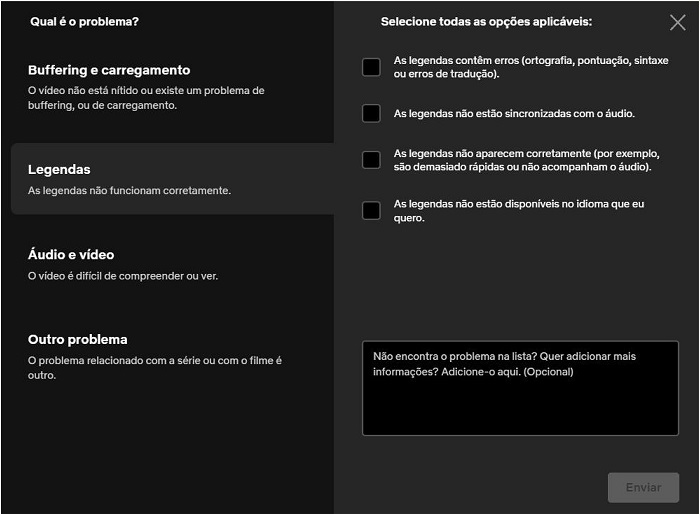 Como dito anteriormente, essas traduções mais “subversivas” estão ganhando elogios nas redes sociais6 e em sites de notícias sobre entretenimento (Paz, 2018), o que colabora para que se perpetuem e promovam uma revisão das normas vigentes de legendagem. Vale chamar a atenção para a relevância da participação dos prosumers no contexto da Web 2.0, não só através de comentários externos como também avaliando as traduções na própria plataforma do serviço de streaming. A Netflix disponibiliza um recurso de feedback instantâneo para problemas de exibição de seu conteúdo que inclui a opção “Legendas” (Figura 2). Ao ativar o recurso, o assinante pode relatar problemas como legendas ausentes, difíceis de ler, que não correspondem ao áudio e com erros de ortografia e tradução.