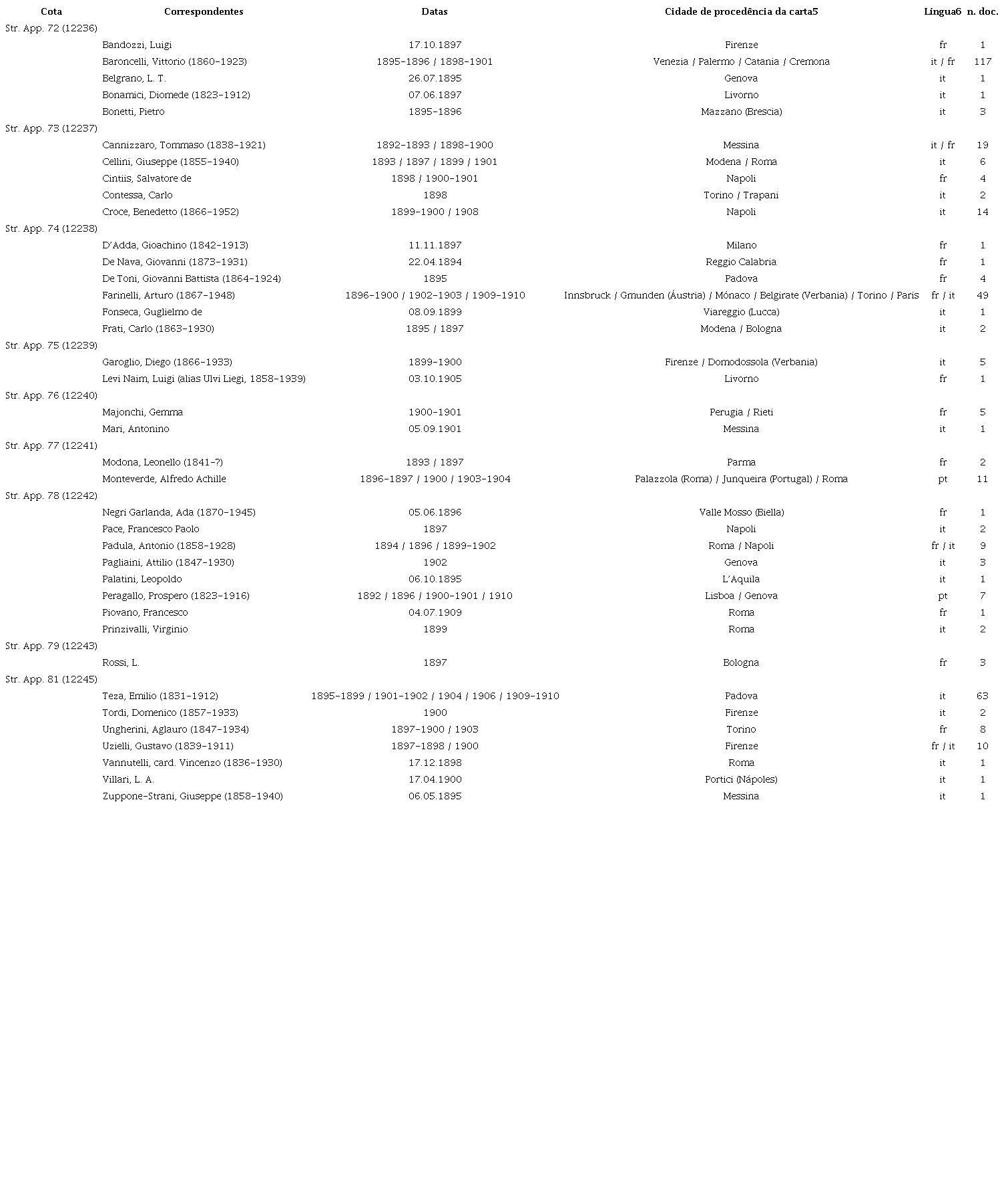 Sendo, portanto, o meu propósito o de estudar as cartas dos correspondentes italianos de Joaquim de Araújo, o primeiro passo a dar nesta direção foi o de individuar quais foram, a consistência numérica das cartas deles conservadas no espólio e outros dados, como a extensão cronológica do intercâmbio epistolar, os lugares de procedência das cartas e as línguas em que a correspondência era trocada. O resultado dessa fase do estudo pode ser apreciado na tabela que segue, em que organizei estas informações acrescentando, onde foi possível encontrá-los ou reconstruí-los na base das hipóteses sobre os indivíduos a que se referem, os extremos do nascimento e da morte de tais correspondentes: