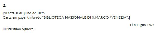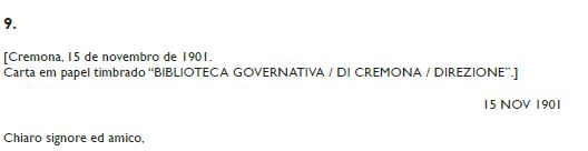 Antes de mais, a transcrição das cartas permitiu definir o número exato delas. De facto, no fascículo Baroncelli da caixa cotejada por Str. App. 72 (12236) são conservadas 11 cartas, mas só 9 foram escritas pelo próprio Baroncelli. As outras duas, a n.º 3 (datável, com toda a probabilidade, a 9 de dezembro de 1898) e a n.º 913 (que leva a data de 6 de janeiro de 1900), terão sido catalogadas nesse mesmo fascículo por ter sido escritas em papel timbrado “BIBLIOTECA NAZIONALE DI S. MARCO / VENEZIA” quase no mesmo período em que Baroncelli era funcionário da Biblioteca Marciana, ou seja entre dezembro de 1892 e maio de 1899. Sendo, porém, tanto a caligrafia como o conteúdo das duas cartas bastante diferente dos das cartas de Baroncelli, a análise conjunta destes dois elementos e, sobretudo, da assinatura levou a identificar o remetente delas como sendo Salomone Morpurgo, diretor da Marciana desde março de 1898 (depois da morte do anterior diretor, Carlo Castellani, em outubro de 1897) até agosto de 190514.