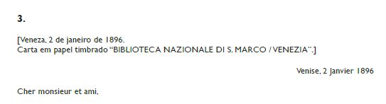 De que tal tradução – ou, melhor dito, a primeira parte dela – tenha efetivamente visto a luz temos confirmação na sucessiva carta de Baroncelli (n.º 3), datada a 2 de janeiro de 1896, na qual, em francês, anuncia: “Les ‘Veglie Veneziane’ ont paru avec votre lettre charmante et très aimable pour moi et la traduction des trois premiers chapitres du roman”. A carta maravilhosa e muito gentil (“lettre charmante et très aimable”) corresponde ao prefácio bio-bibliográfico referido na carta anterior, que antecede a tradução dos três primeiros capítulos do romance assinada por Baroncelli e publicada no n.º XI-XII do ano 1 (1º de dezembro de 1895) da revista Nuove Veglie Veneziane17. Araújo publicará o prefácio (ou carta) como opúsculo solto no mesmo ano de 1896, com o título Julio Dinis. Lettera al Signor Vittorio Baroncelli per accompagnare la traduzione dei [sic] “Pupille del signor curato”, de forma a podê-lo oferecer, como era costume dele, aos seus correspondentes: é o caso, por exemplo, de Emilio Teza – cuja cópia é a à qual se pode ter acesso no seu espólio, também legado à Biblioteca Marciana – e da atrás citada Roxana Lewis Dabney, que agradece o cônsul português pela dádiva na única carta dela que se conserva no espólio Araújo18.
