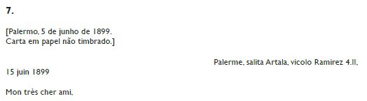 Quanto às línguas utilizadas para estas conversas escritas, não estranha o frequente uso do francês, que desde meados do século XVII se impusera como língua franca e da cultura em toda a Europa. O italiano era língua compreendida, e portanto lida sem dificuldade, por Araújo: “mi è stato affermato ch’Ella, senza parlarla correttamente, comprende la nostra lingua”, afirma Vittorio Baroncelli na sua primeira carta ao então recém-nomeado cônsul de Portugal na Itália. Pelo contrário, não é fácil elaborar uma explicação persuasiva para a alternância entre as duas línguas nas correspondências do próprio Baroncelli, de Cannizzaro, Farinelli, Padula e Uzielli. Não é possível, por exemplo, justificá-la com alguma suposta perda de hábito ou familiaridade devida a certo hiato temporal entre cartas sucessivas: este, com efeito, poderia ser o caso de Cannizzaro – entre a carta em italiano de 27 de outubro de 1893 e a sucessiva retomada dos contactos em francês, a 12 de março de 1898, passam quatro anos e meio12 –, mas não esclareceria a mesma passagem de uma a outra língua no caso de Baroncelli, que troca o italiano das primeiras duas cartas com o francês das sucessivas no espaço de seis meses (8 de julho de 1895-2 de janeiro de 1896) e volta a escrever em italiano em 1900. Os únicos dois correspondentes a utilizar o português são Alfredo Achille Monteverde e Prospero Peragallo, talvez por exercerem, os dois, cargos que lhes requeriam um conhecimento ativo e aprofundado da língua: de facto, naqueles anos Monteverde era o primeiro secretário da embaixada de Portugal na Itália, enquanto Peragallo era um presbítero da ordem dominicana que desde 1865 dirigia a igreja de Nossa Senhora do Loreto em Lisboa.