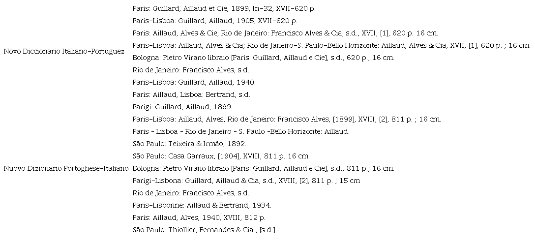 Raqueni, R. E. & La Fayette, L. Castro de (1899). Novo diccionario italiano-portuguez, contendo todos os vocábulos da língua usual, com a pronúncia figurada, e os nomes próprios geralmente usados. Guillard, Aillaud et Cie.