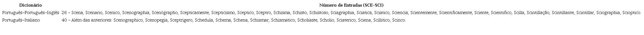 Esta tendência é confirmada por uma análise comparativa das entradas relativas a uma sequência de palavras com grafias etimológicas associadas a formações a partir de raízes eruditas (SCE-SCI). O dicionário português-inglês apresenta 26 entradas nesta secção, enquanto o dicionário português-italiano inclui todas as palavras do primeiro e acrescenta 14, o que representa um aumento superior a 50%.