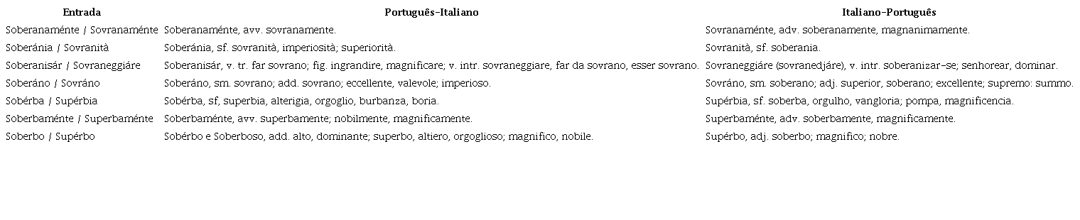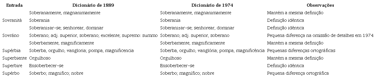 Ambas as edições incluem termos como sovranamente, sovranità, sovraneggiare, superbamente, superbia, superbire, superbo, e superbiente. Não se observam entradas suprimidas nem novas entradas no corpus de 1974 em comparação direta com as entradas de 1889, no que diz respeito aos termos analisados. Algumas entradas do dicionário de 1889 foram suprimidas, como sacabolas, sacabocado, sacafilaça, sacapelouro, sacatrapo, saccomão, indicando uma obsolescência desses termos.