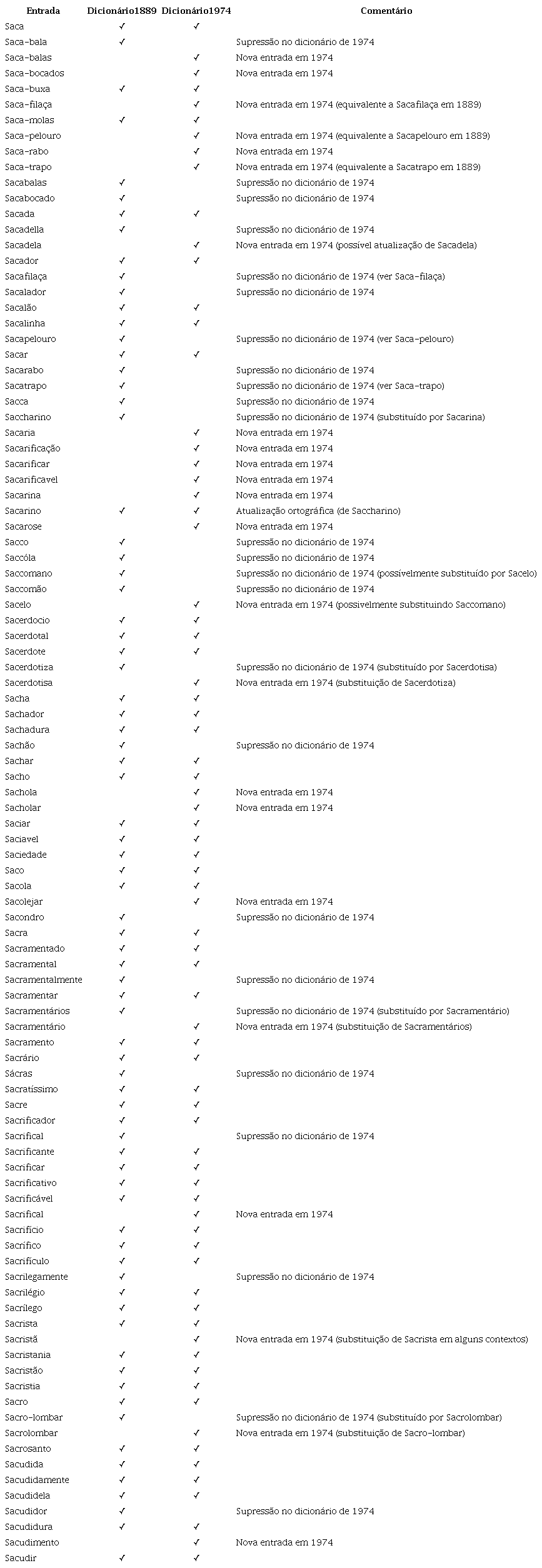 Analisando uma série mais extensa de entradas (SAC-, ver Apêndice), verifica-se que há uma tendência para introdução de novas entradas, que correspondem a palavras que não estão presentes na versão anterior, mas que não eram desconhecidas no final do século XIX, como são os casos de sacarificação, sacarificar, sacarifícavel, sacarina, sacarose, que já se encontravam no dicionário português-inglês, sugerindo a vulgarização de vocabulário técnico. Encontram-se também palavras novas como sachola, sacholar e sacudimento, refletindo novas preferências lexicais e derivações de palavras.