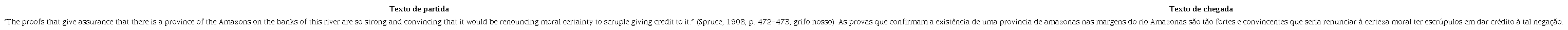 Dessa forma, apesar de concordarmos e utilizarmos o termo “indígena” ao nos referirmos aos povos originários, entendemos que empregá-lo na tradução do texto de Spruce seria um rompimento com o olhar colonizador dos que fizeram parte do achamento do Brasil e que não distinguiam os vários povos originários. É a subcompetência de conhecimentos sobre tradução (Hurtado Albir, 2020) que nos permite alcançar a compreensão de que, ao mesmo tempo que nos aproximamos do texto de partida, precisamos nos afastar de algumas de nossas crenças para que o contexto linguístico-histórico no qual o texto foi escrito seja mantido e alcançado pelos leitores da atualidade.