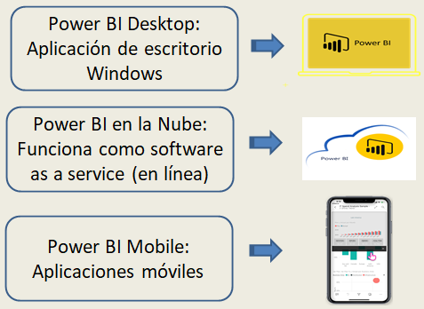 Power BI es una colección de servicios de software, conectores y aplicaciones que convierte orígenes de datos diferentes y no relacionados en un modelo coherente que revela y visualiza detalles analíticos a partir de la segmentación de datos. Las ventajas para la empresa de utilizar Power BI radica en el abanico de posibilidades que se abre en la toma de decisiones a partir de dar un seguimiento puntual al cumplimiento de los objetivos de la organización, se dispone de información en tiempo real que permite realizar reportes de los indicadores claves de desempeño. Puede resumirse como la integración de aplicaciones de escritorio más un servicio Web que permite crear informes analíticos con elevado nivel de interactividad y dinamismo. Dentro de los antecedentes se pueden citar los servicios de inteligencia de negocios integrados en SQL Server desde SQL Server 2005 (basado en la integración de servicios, servicios de análisis y reportes). Otro antecedente importante fue disponer con BI integrado en Excel desde su versión 2010 mediante componentes adicionales (Power Query, Power Pivot, Power View y Power Map). El ciclo de vida de Power BI es importar, modelar, visualizar y compartir. Para ello se apoya en tres (3) componentes básicos: Power BI Desktop, Power BI en la Nube y Power BI Mobile, como se muestra en la figura 1.