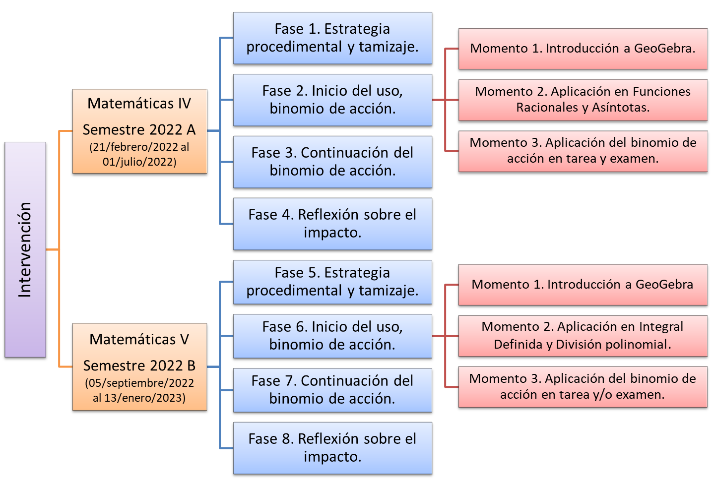 Dentro del Colegio de Bachilleres de la Ciudad de México, Plantel 1 “El Rosario”, se llevó a cabo una intervención académica en el Semestre 2022 A y el Semestre 2022 B, comprendido entre el 21 de febrero de 2022 al 01 de julio de 2022 y entre el 05 de septiembre de 2022 al 13 de enero de 2023 respectivamente, con la intervención del binomio de acción: mobile-learning (a través del uso de la aplicación GeoGebra) y enfoque STEAM en un plan de acción de 8 fases, después de llevarse a cabo una Fase de Diagnóstico.