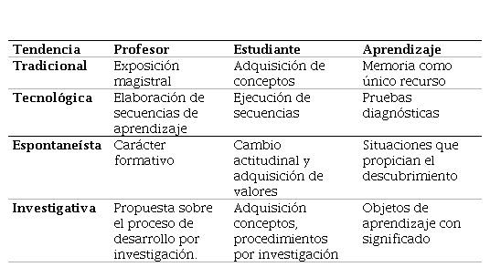 La enseñanza se caracteriza por ser un proceso activo, el cual requiere del dominio de la disciplina con conocimientos matemáticos básicos y rigurosos, necesarios para la comprensión del mundo de las matemáticas, pero además del dominio de un conjunto de habilidades y destrezas necesarias para un óptimo desempeño de la labor como docente de matemáticas (Mora, 2003). Así, Porlán (1995) explica cuatro tendencias didácticas, donde el profesor concibe la enseñanza y el aprendizaje de la matemática: tradicional, tecnológica, espontaneísta e investigativa (ver Tabla 1).