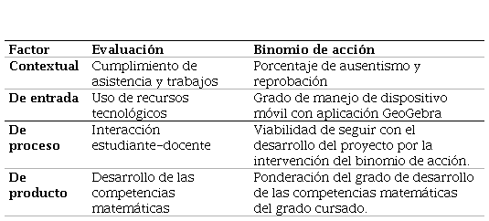 En tanto que los factores de proceso se ligan con la interacción estudiante-docente, considerando un canal de comunicación abierto y estable para generar una mayor sinergia. Finalmente, los factores de producto se valoran con el desarrollo de las competencias matemáticas de los estudiantes. Los criterios de la evaluación se reflejan en la Tabla 2.