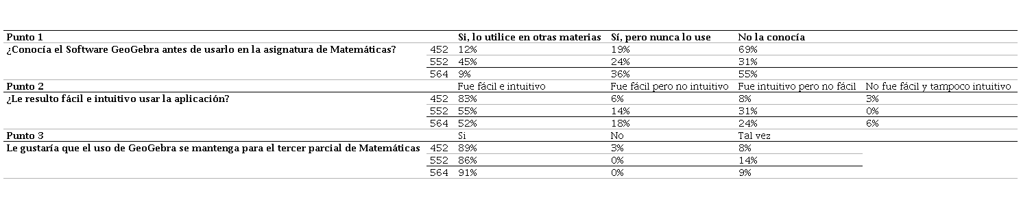 Es posible observar que en el punto 1, los grupos 452 y 564 no conocían el Software GeoGebra en su mayoría, el grupo 552 indica que solo 1 de cada tres estudiantes. Para el punto 2, los tres grupos indican que les resulto fácil e intuitivo en un porcentaje mayoritario. Finalmente, para el punto 3, los grupos por unanimidad precisan que les gustaría que se mantenga el uso para el tercer parcial. Existe una homogeneidad en cuanto al desconocimiento de la aplicación, así como los beneficios que aporta; sobre lo fácil que resulta usarla y sobre la continuidad que permite el desarrollo de las competencias matemáticas a lo largo del curso.