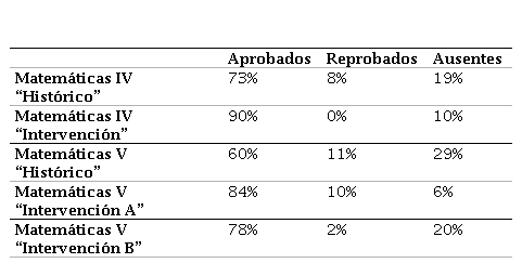 En la Tabla 5, se muestran los porcentajes finales semestrales de la asignatura de Matemáticas IV Cálculo Diferencial, con un 90% de aprobación, 0% de reprobación y 10% de ausentismo. Existiendo un aumento del 23% con respecto al histórico de aprobación registrada, disminución del 100% en reprobación y 48% en ausentismo respecto al histórico. Traduciéndose en la recomendación de realizar sin cambios de inicio a fin, el desarrollo de la ruta de intervención binomio de acción: mobile-learning y STEAM. A su vez la asignatura de Matemáticas V obtuvo un 84% de aprobación, 10% de reprobación y un 6% de ausentismo para la Intervención A, la cual constó de dos semestres continuos del binomio de acción; existiendo un aumento del 40% con respecto al histórico de aprobación registrada, disminución del 9% en reprobación y 79% en ausentismo respecto al histórico. Para la Intervención B, el cual tuvo un semestre de intervención con el binomio de acción, los resultados fueron de un 78% de aprobación, 2% de reprobación y 20% de ausentismo, lo que representa un aumento del 30% con respecto al histórico de aprobados, un 80% de disminución en reprobados y un 31% de depreciación en el ausentismo.
