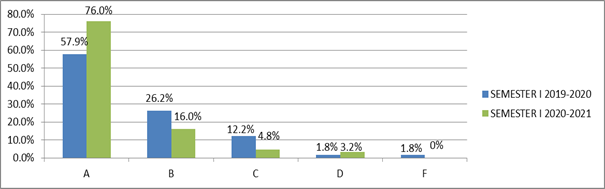 Como se puede apreciar en la gráfica anterior, las calificaciones “A” del primer semestre del año 2020 – 2021 superan a las obtenidas por los estudiantes en el mismo periodo del año 2019 – 2020, lo que puede ser interpretado como una muestra de preferencia y/o adaptación al sistema de ERE.