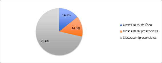 En la consulta citada, participaron 7 docentes, de los cuales 5 optaron por el modelo semipresencial, representando así el 71.4% de los votos. Los 2 docentes restantes se dividieron entre los sistemas 100% virtual y 100% presencial, lo que corresponde al 14.3% cada uno. Estos resultados se muestran visualmente en la figura 1.