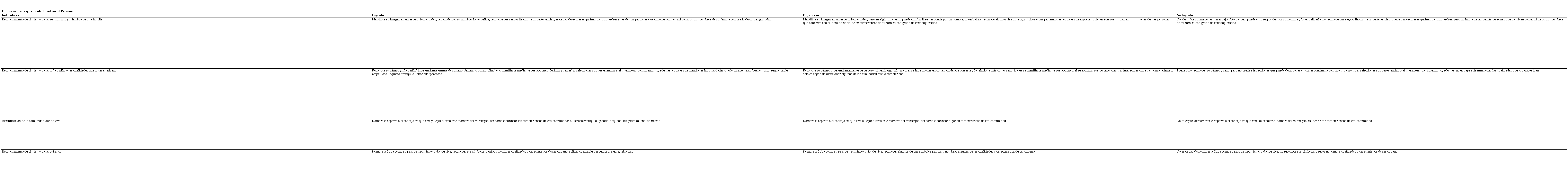 Para valorar la formación de rasgos de identidad social personal del niño se determinaron cuatro indicadores, cuyos resultados se expresan como logrado, en proceso y no logrado, con sus respectivos descriptores de medida (ver tabla 1).