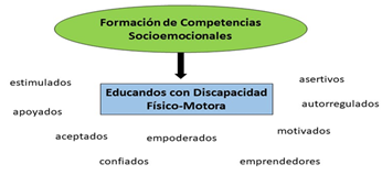 A partir del estudio de los enfoques y criterios que sobre las competencias socioemocionales se han hecho, los autores de esta investigación consideran la formación de competencias socioemocionales en educandos con discapacidad físico-motora, como aquellas habilidades, capacidades, aptitudes y destrezas que el individuo con discapacidad adquiere a lo largo de su desarrollo cognitivo que le permite afrontar los retos y dificultades que se le presenten en los contextos de actuación y que a su vez le faciliten su empoderamiento y capacidad de adaptación al medio, logrando elevar su calidad de vida y su crecimiento personal y espiritual como ser humano. Se considera además que las competencias socioemocionales en educandos discapacitados favorecen el manejo adecuado de las relaciones humanas de estos y la sociedad en general.
