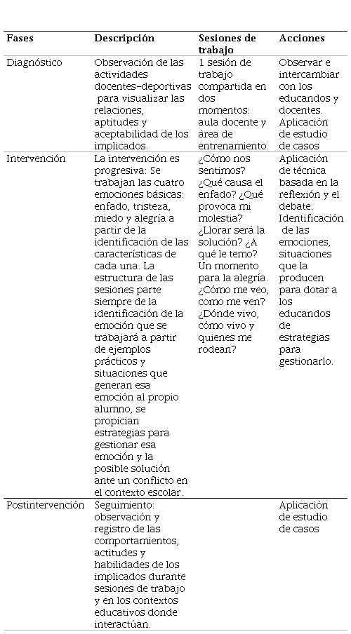 A partir de los datos recopilados y de la observación individualizada de cada uno de los integrantes del grupo seleccionado, se determinó de conjunto con la opinión, supervisión y la valoración de especialistas de la educación especial, la necesidad de realizar una sesión de trabajo quincenal con los implicados, en la que se trabajaron las emociones y cómo automanejar las mismas ante situaciones cotidianas dedicando a cada emoción una sesión de trabajo (ver tabla 2).